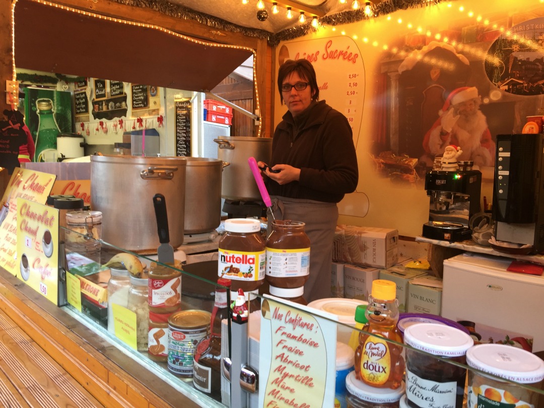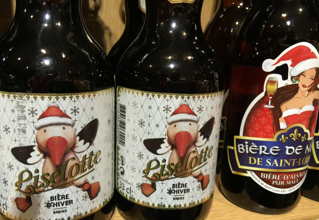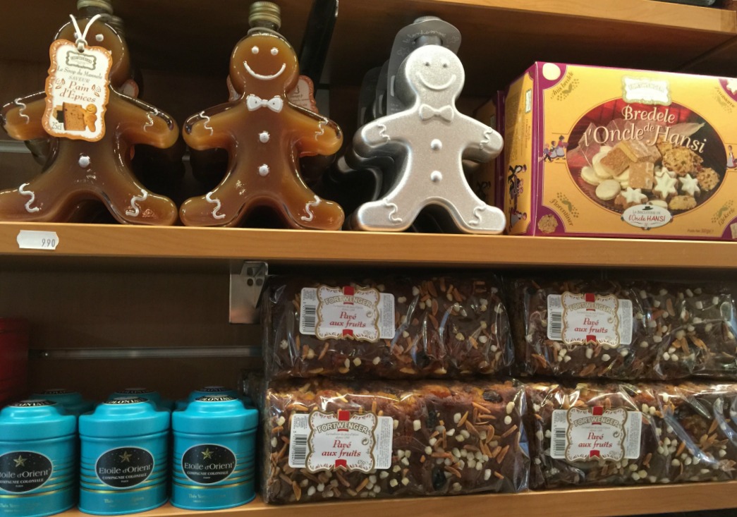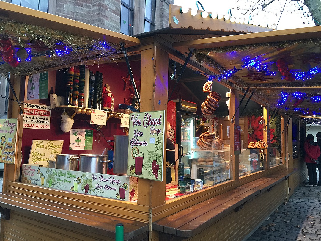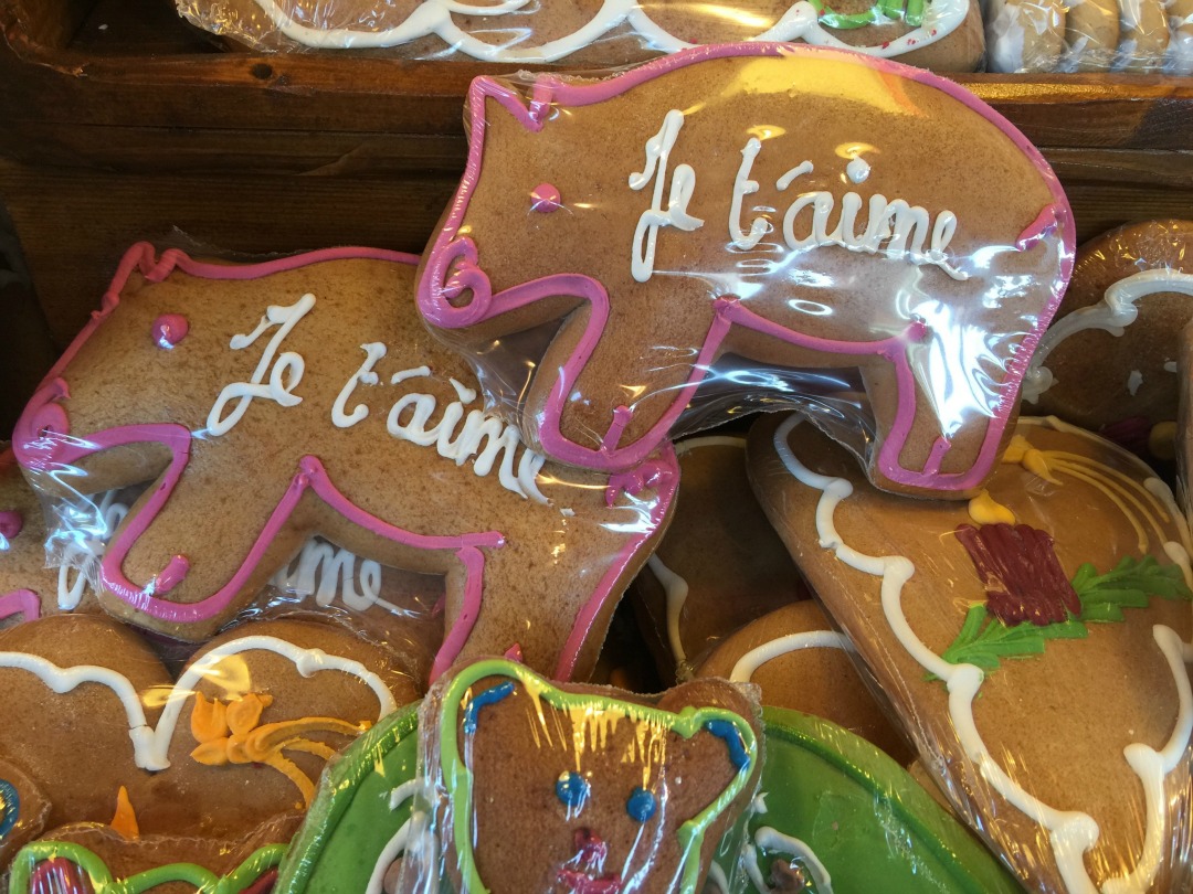 At Christkindelsmarik you get all the usual Christmas market smells that are so heavenly at the German markets, but here you will find some French goodies like crepes, macaroons, and brioche. Familiar market staples like giant pretzels and cookies, but in Strasbourg they have “Je’ Taime” written on them. It’s a feast of smells, including the ever present spiced wine of Vin Chaud (Gluhwien in German). You can get non-alcoholic hot apple cider drinks and Lait de Poule, a traditional eggnog drink spiked with alcohol. You can also find a variety of Christmas beers in festive bottles.