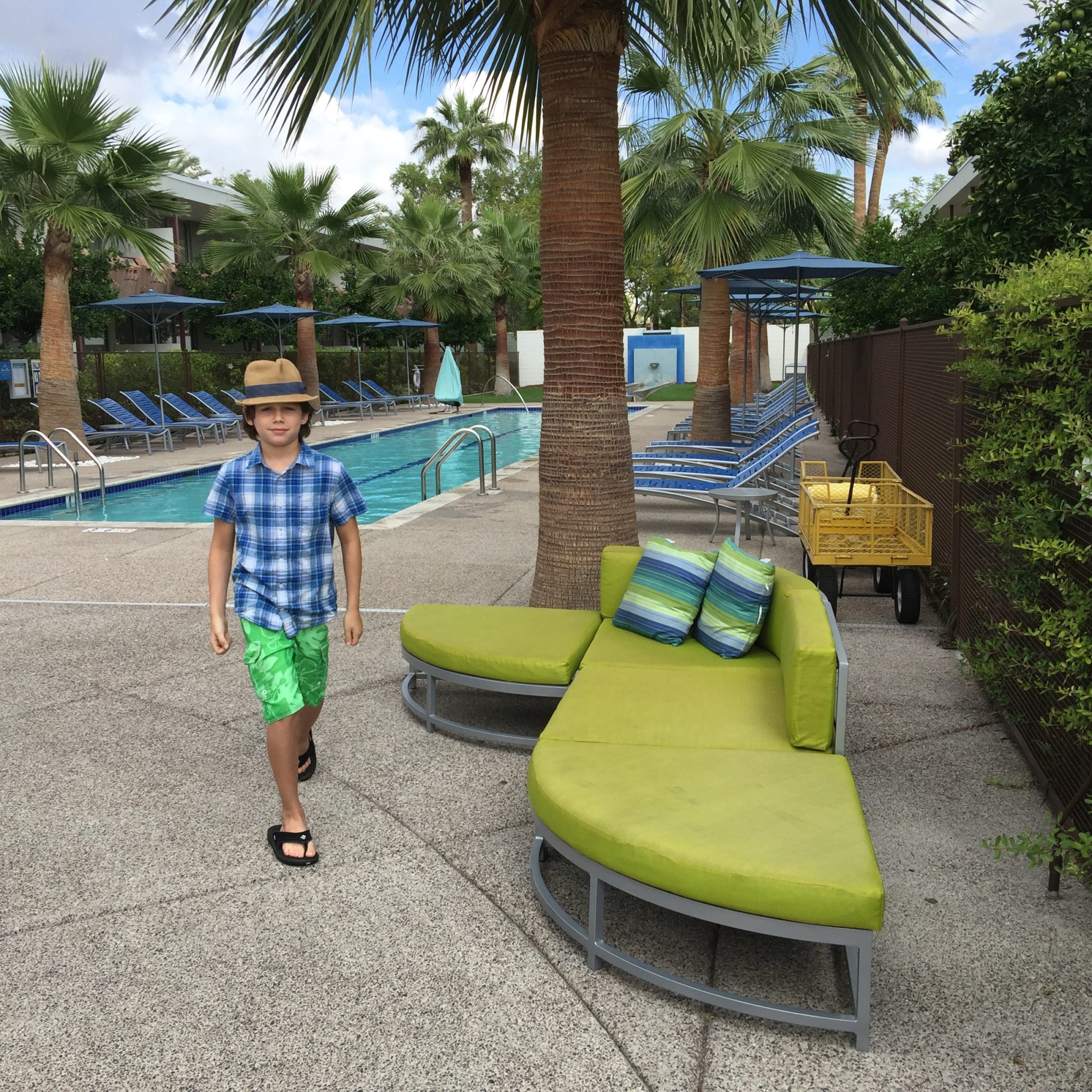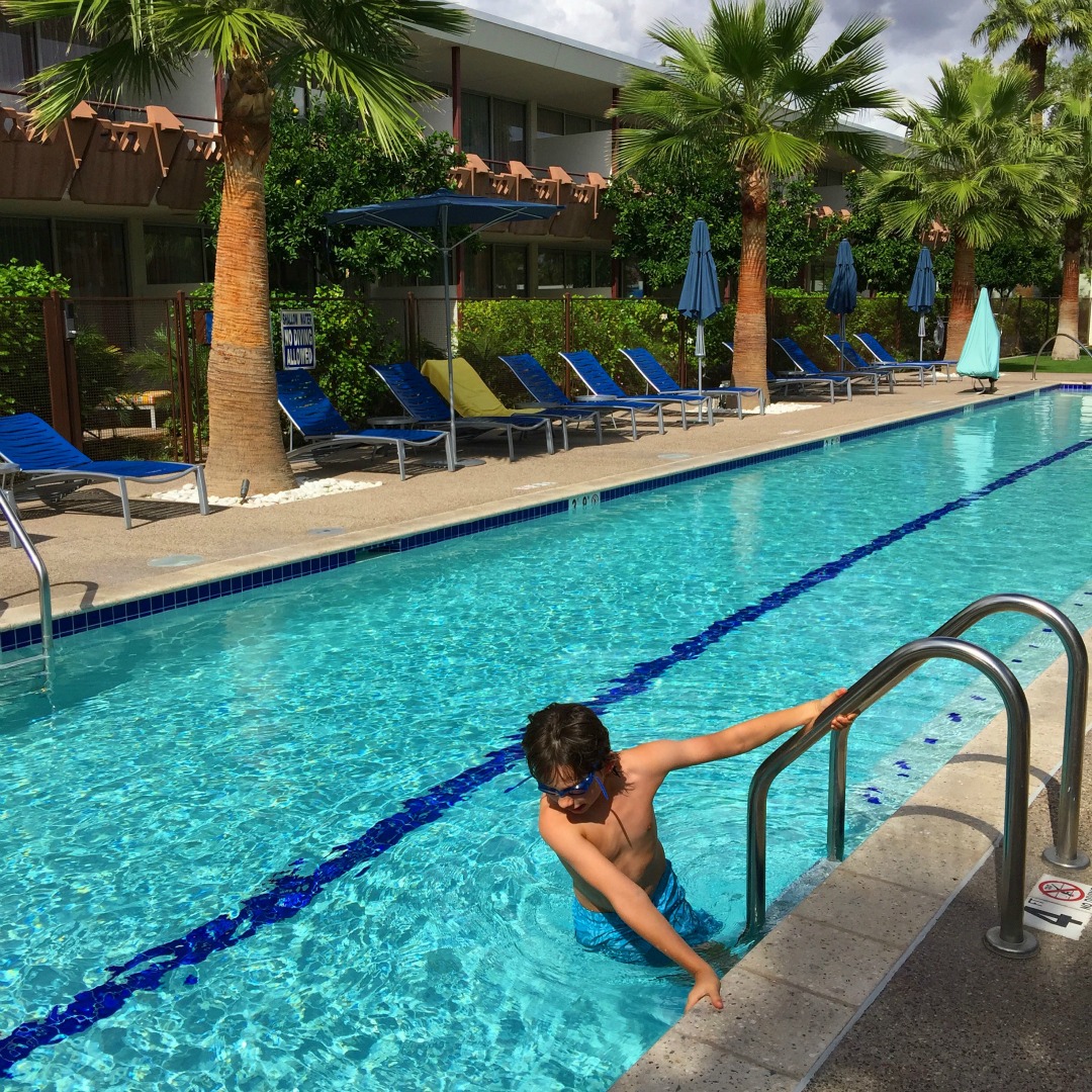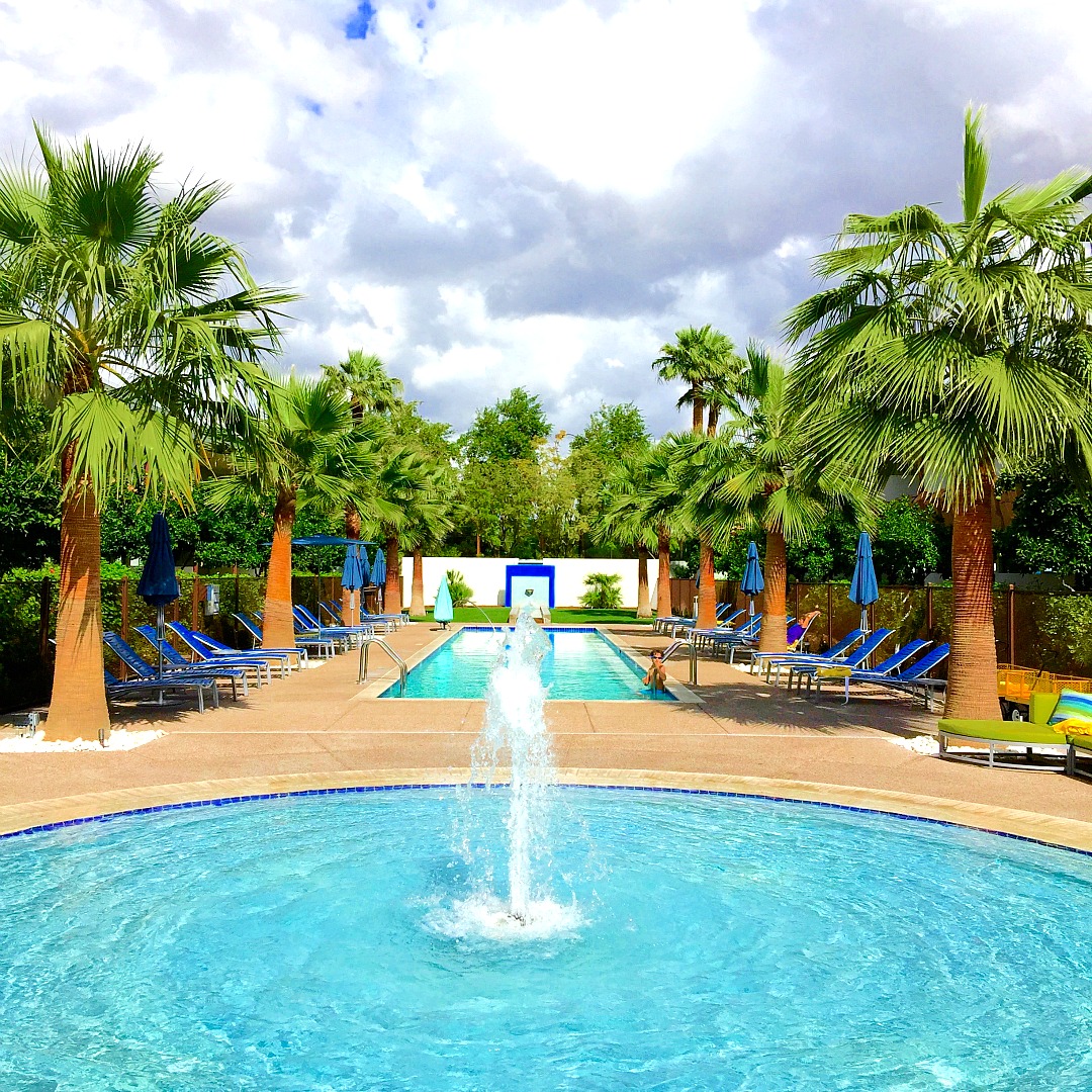 What a treat to have a dedicated lap pool! Swimming laps is my favorite way to get in a good workout and what a thrill to swim at Valley Ho with swaying palm fronds overhead. At night the lap pool and fountain are lit up in glowing purple–it’s gorgeous. There is a gym as well.