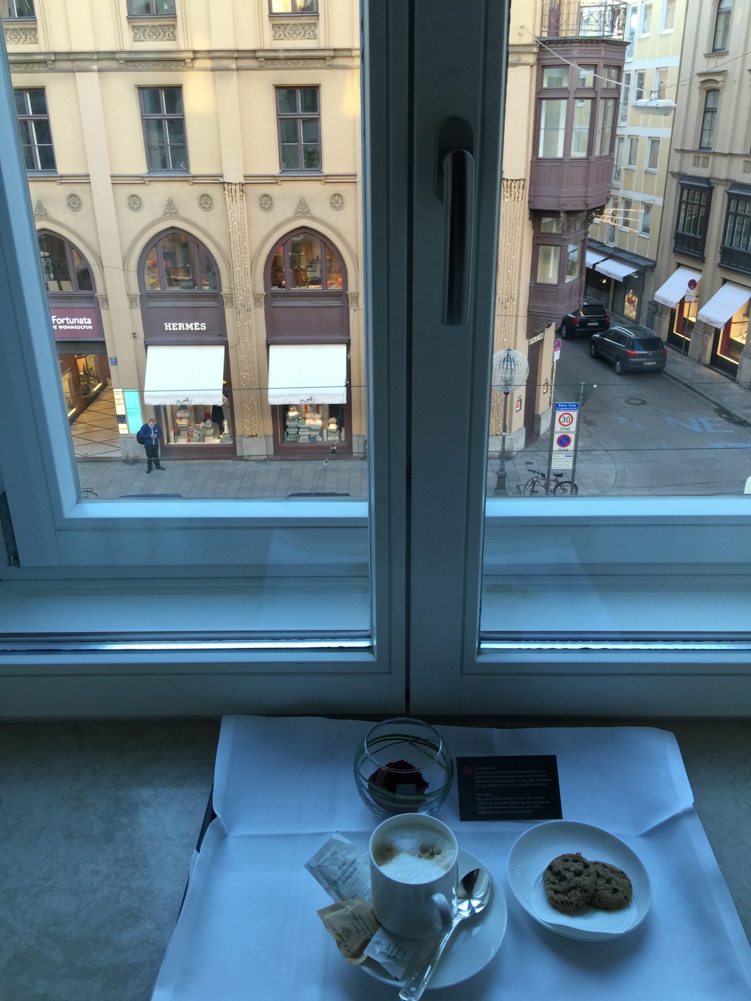Much more welcome than your standard wake-up call, this hotel offers guests the decadent and complimentary service of waking you up with coffee. How wonderful it is to see a smiling face with a hot cappuccino at your door as you wake up. Next to the coffee are two cookies. The Hotel Vier Jahreszeiten Kempinski has a renowned pastry chef.