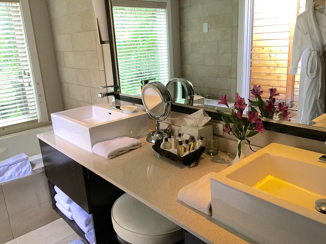 The floors are gray wood, and the color scheme is crisp white and neutrals. It’s modern and like the rest of the place, tranquil. Huge windows offer views of the creek and trees.