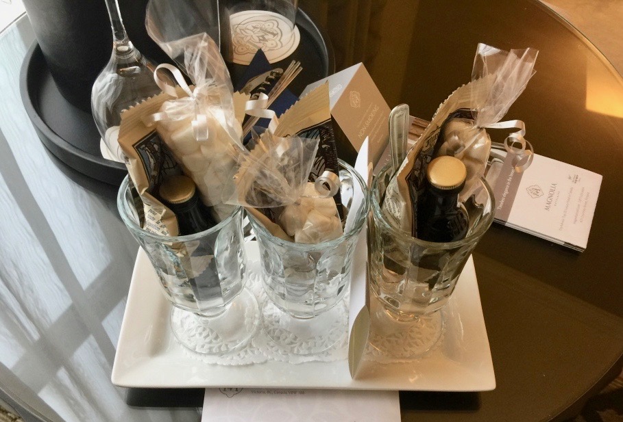 Rooms at the Magnolia Hotel & Spa are plush with a soothing color pallet of gray, blue, taupe, and white. The fireplace creates a perfect winter vibe and they had hot chocolate, marshmallows and Bailey’s Irish Cream liquor waiting for us upon arrival.