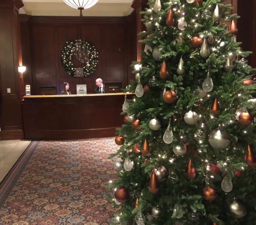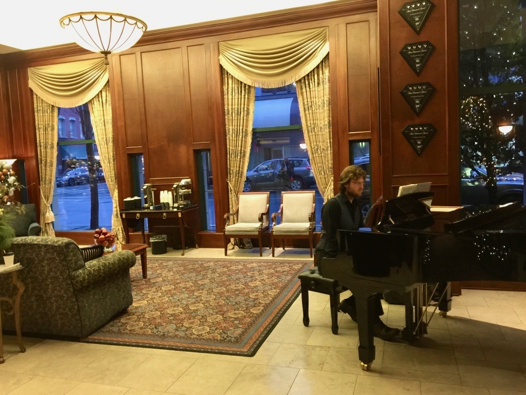The lobby is cozy and welcoming with hot chocolate and cookies, a fireplace, Christmas tree, and live piano playing from time to time. It’s a great place for people to meet up before heading out on the town.