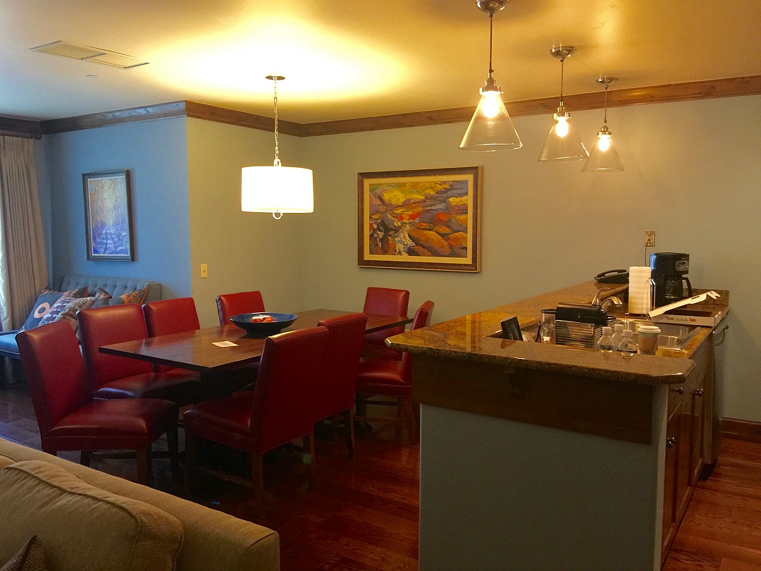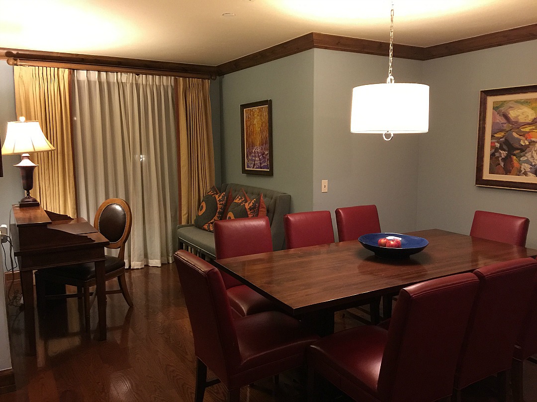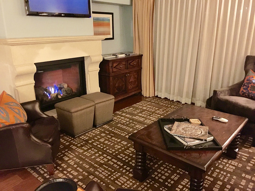 The room was huge. It was open concept with a kitchen, dining area, work space with a desk, and living room with fire place and balcony. There is plenty of comfortable seating, a tv in each room, three full bathrooms and a washer/dryer which is handy when you are traveling with children.