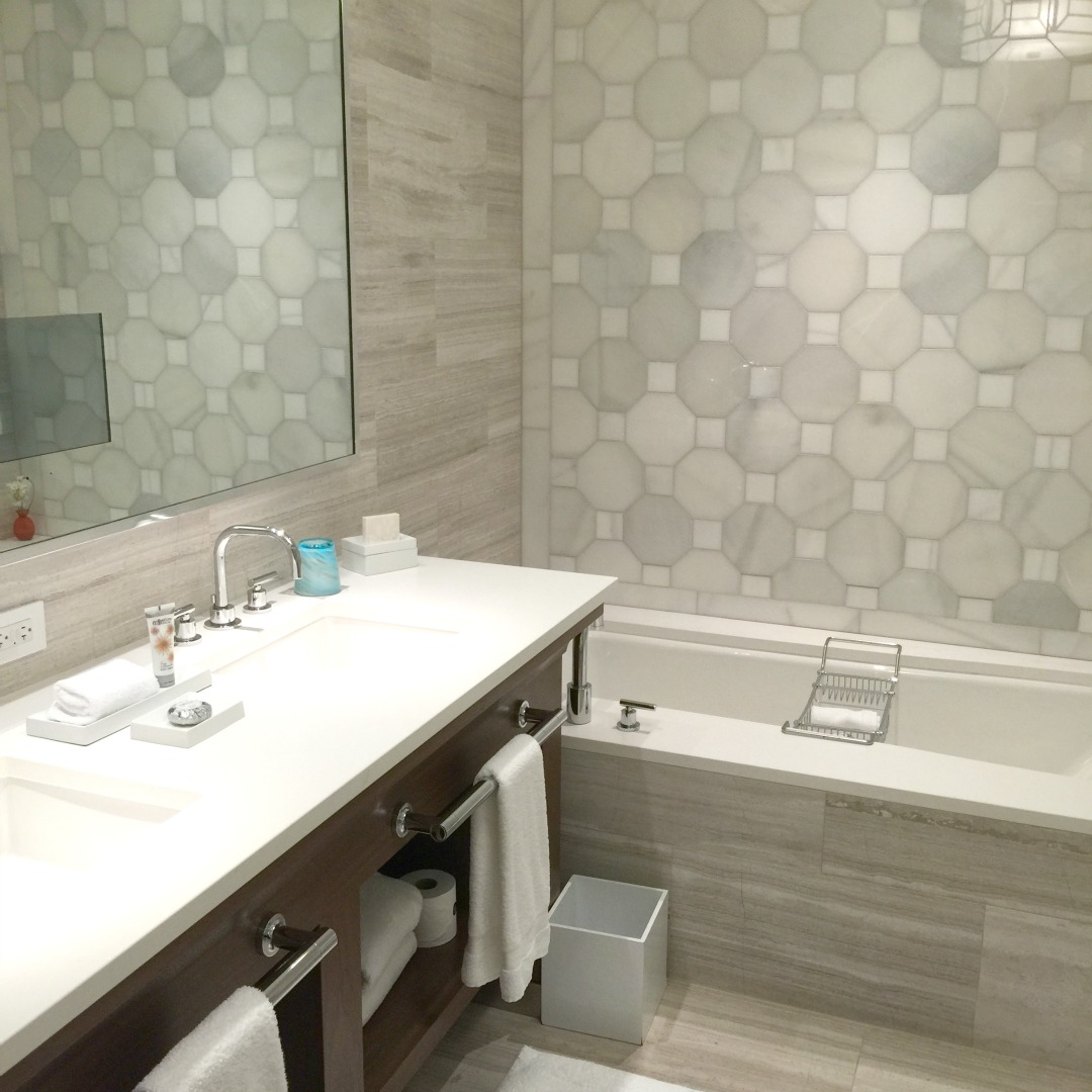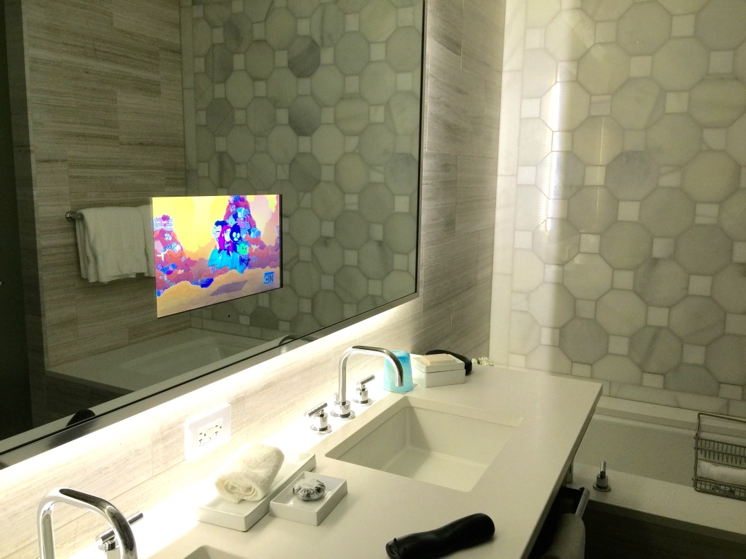 Honeycomb was a repeated geometric motif throughout the hotel and when I walked into the bathroom and saw the honeycomb marble I was in a design-swoon. It is stunning. There’s a soaking tub, shower and integrated tv in the mirror.